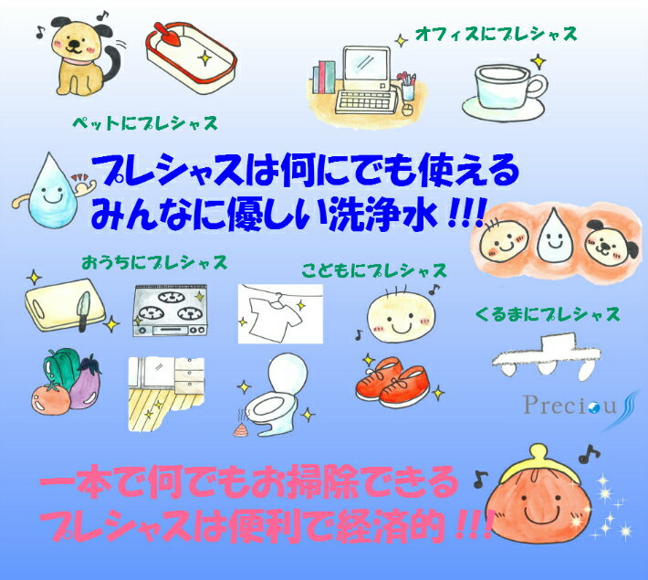 プレシャスの説明用 途洗浄剤成 分 強アルカリイオン水<br>水99.9% 炭酸カリウム0.1%液 性 アルカリ性 Ph12.5製造元株式会社東建社プレシャス販売部 使用上の注意 ◇用途以外には使用しないでください◇万一飲み込んだ場合は水を飲む等の処置をし、必要に応じて医師にご相談ください◇万一目に入った場合はすぐに流水で洗い、必要に応じて医師にご相談ください◇顔や体には使用しないで下さい◇過敏症の方・皮膚の弱い方は保護手袋を着用ください◇家電等にご使用の際はショートや感電に気を付け、機器の取扱説明書をご確認の上ご使用ください◇子供の手の届く場所には置かないでください◇使用できるかわからない場合は、目立たないところで試してから使用してください◇希釈して洗浄水を作る際は、水道水混入により使用期限が短くなるため、希釈する際には別の容器に移し替えてご使用ください 用 途 油汚れ、お風呂、トイレ、床、壁、扉、冷蔵庫、電子レンジ、電化製品、デスク、椅子、電話、パソコン、会議テーブル、棚、ホワイトボード、身の回りの備品什器 等々…家庭やオフィスでの日常的な清掃・除菌に 使用方法 スプレー等で洗浄水を吹きかけて、拭き取るか洗い流して下さい。